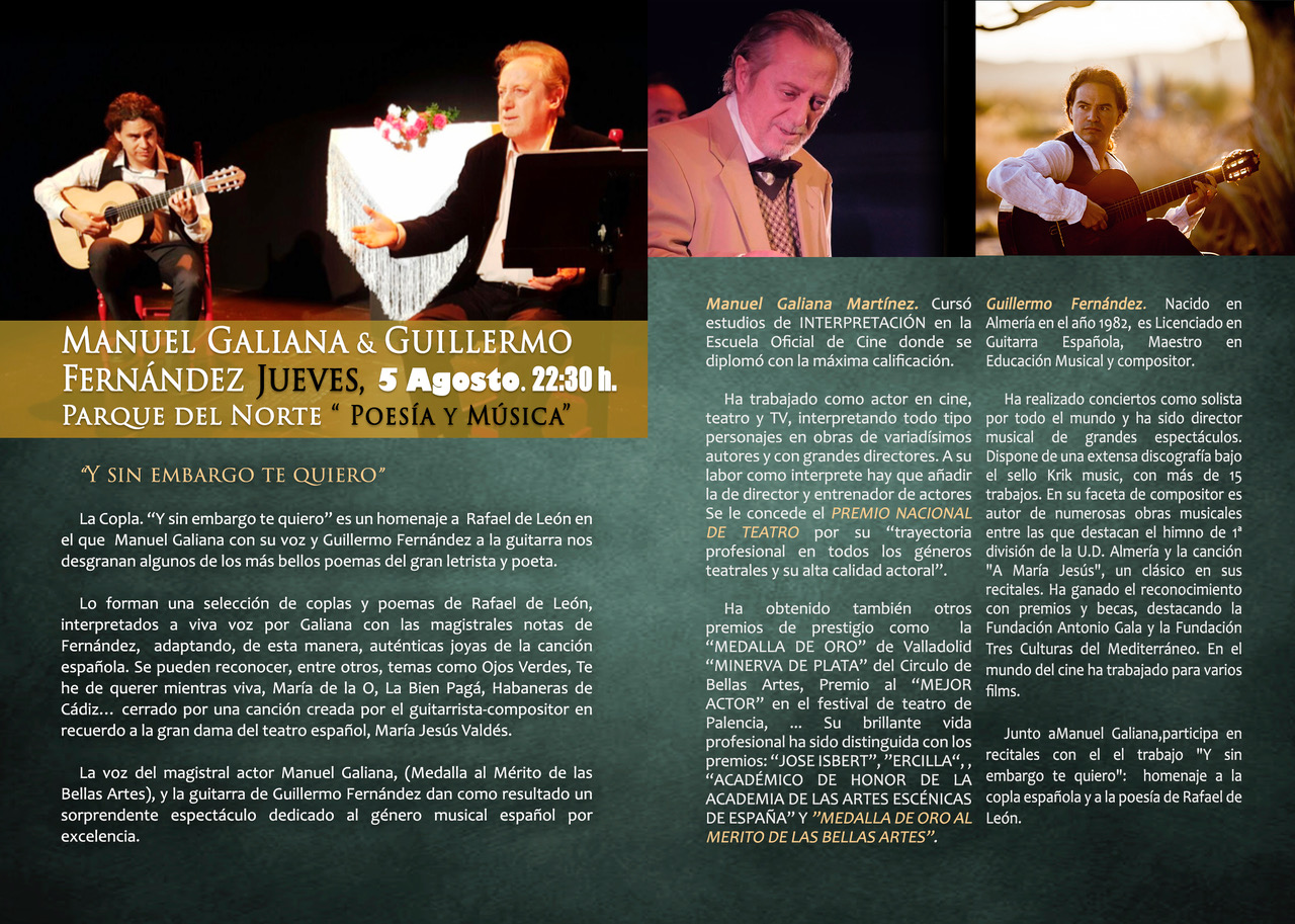 Manuel Galiana y Guillermo Fernández llevan casi una década recorriendo juntos escenarios, y ello se denota en la complicidad que transmiten durante su actuación. La sabiduría y templanza de Galiana se funden con la voz de la guitarra de Guillermo, con un espectáculo con el que han recorrido varios escenarios de la geografía española, destacando: